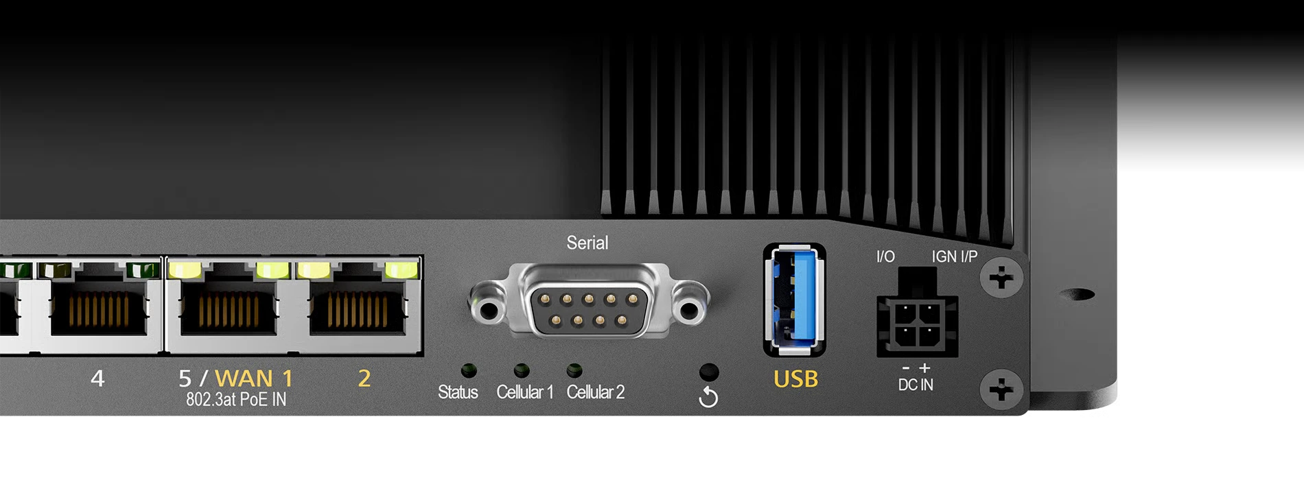 For vehicle applications, it includes a Molex Micro-Fit power connector and a wide input power range with Ignition Sensing capabilities. The device also supports PoE input to seamlessly extend existing SD-WAN infrastructure and provide dual LTE/5G connectivity. Additionally, it has built-in eSIM and SIM Injector support for flexible remote SIM management, and it supports running third-party applications directly using edge computing Docker and Python.